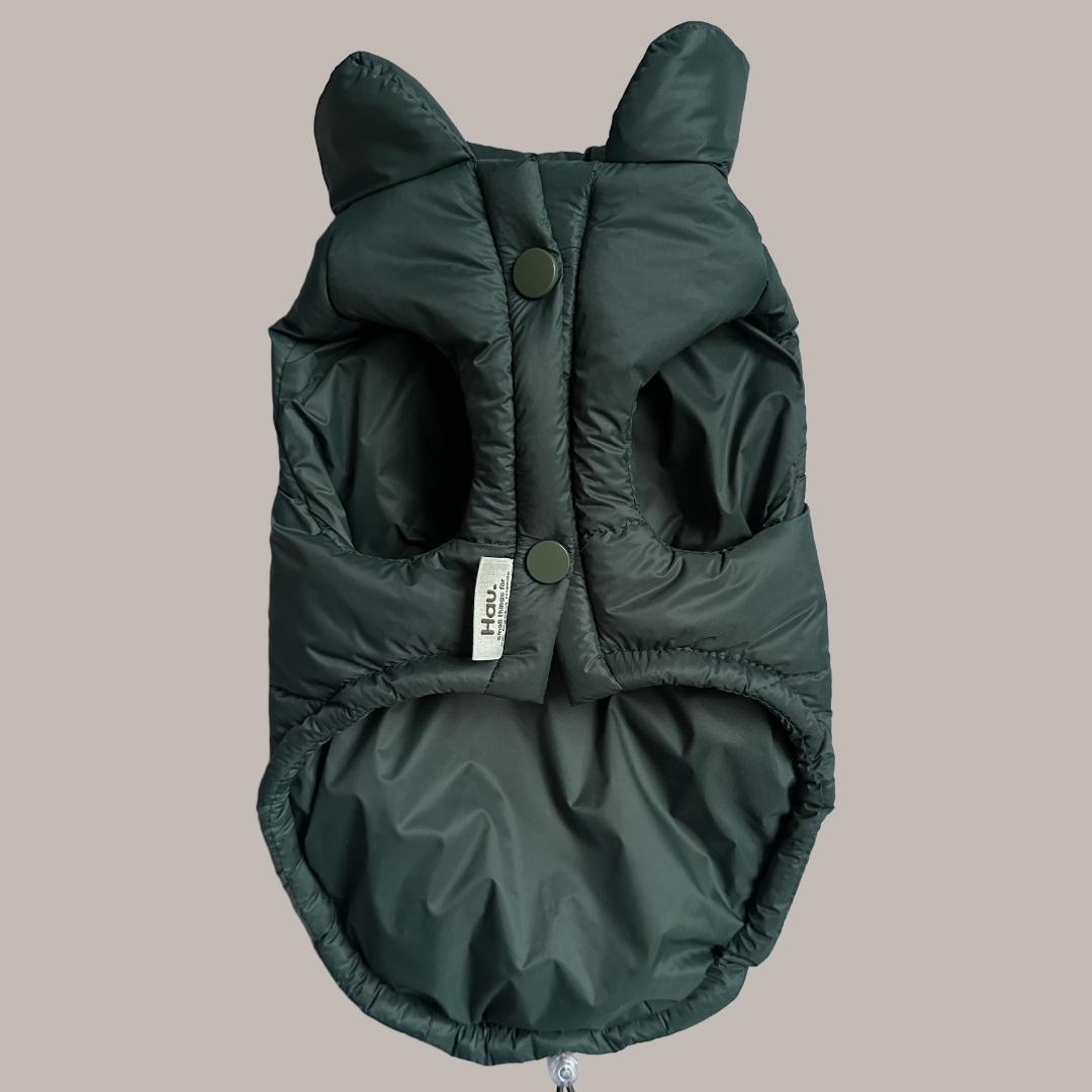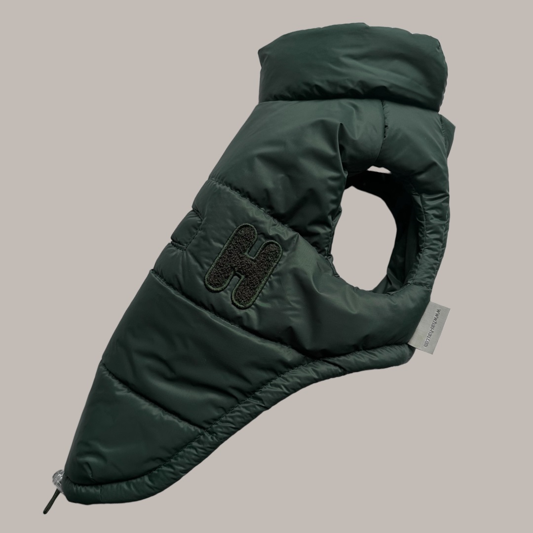 Puff Vest zielony – lekki i ocieplany bezrękawnik dla psa, który zapewnia komfort i ochronę przed chłodem oraz wiatrem.